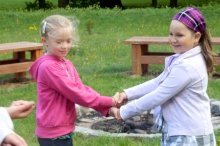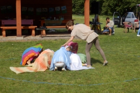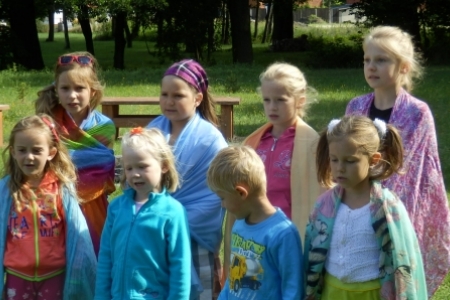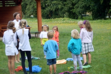Ilość dzieci się zmieniała bo to okres wyjazdów z rodzicami ale po powrocie znowu chętnie dzieci uczestniczyły w zajęciach. Wszystkie zajęcia zgodnie z założeniem państwa Mielników miały charakter zbliżania do przyrody. Pani Joanna uczyła tańca w którym dzieci pokazywały budzenie się przyrody, lekkość wiatru, falowanie wody. Dzieci uczyły się też rozpoznawania ziół i używania ich w kuchni – zrobiły oleje ziołowe i naleśniki z kwiatami i ziołami. Pan Radek zachęcał dzieci do rysowania ptaków i robienia pięknych opakowań na prezenty, w które zostały opakowane wytworzone własnoręcznie mydełka kwiatowo – ziołowe.