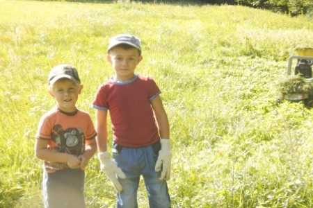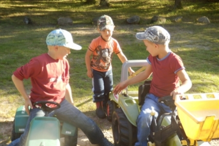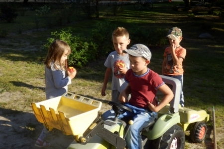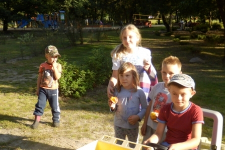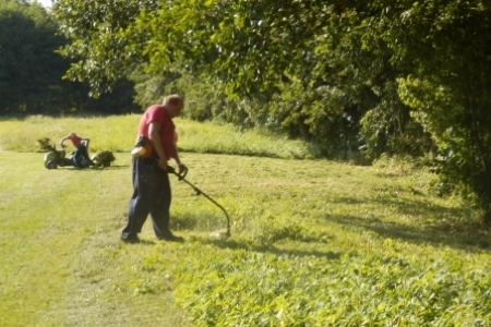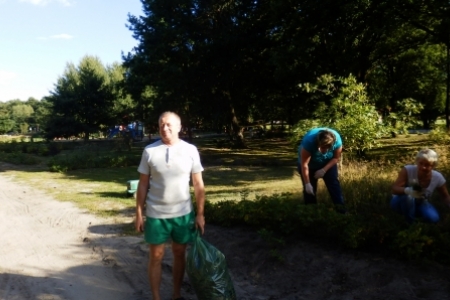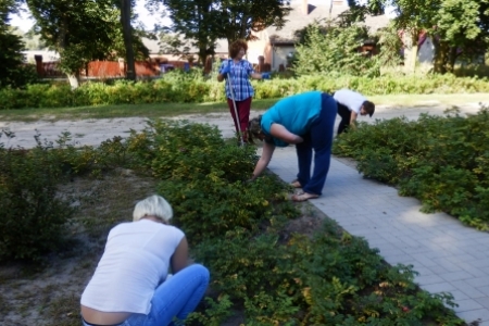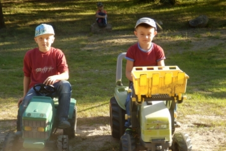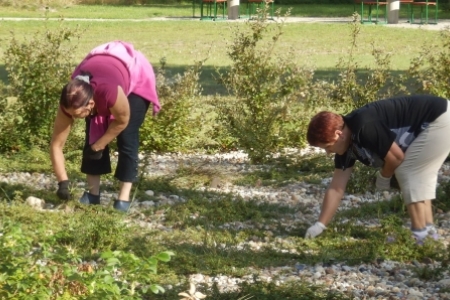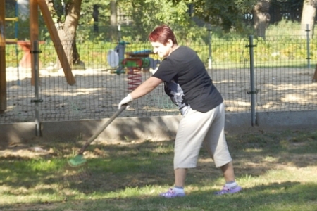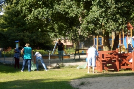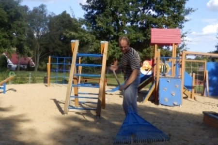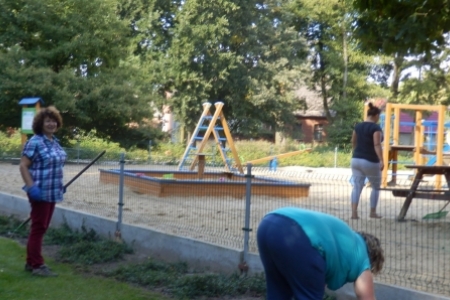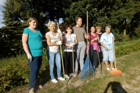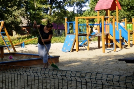 Ale jak zwykle stały zespół zgłosił się do pracy a przy tym pomagały dzieci wyposażone w dwa samochody bardzo przydatne do wywożenia śmieci. Trawnik też jak zwykle przygotowała p. Regina z p. Henrykiem. Plac przy wiatach, gdzie miało być zakończenie wakacji pięknie wykosili panowie.