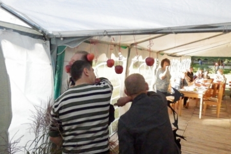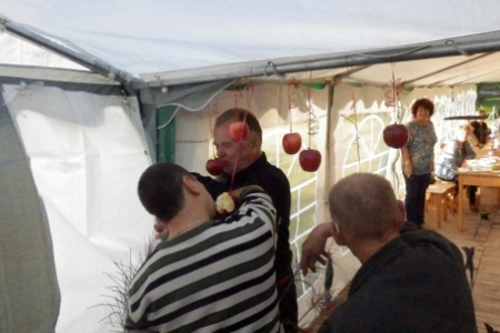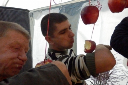Na naszym festynie chodziło po prostu o sztukę zjedzenia fragmentu dekoracji nie posiłkując się dłońmi, choć można było sobie pomóc barkiem i łokciem. Trzech dzielnych panów stanęło do konkurencji ale najskuteczniejszą metodę przyjął pan Bolesław Pilipa, który w kilku kęsach pierwszy pochłonął jabłko – no i nie będzie szarlotki.