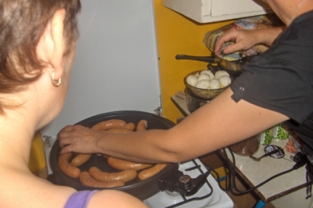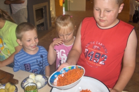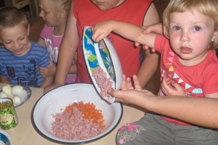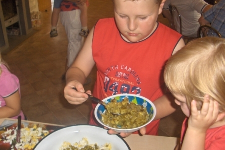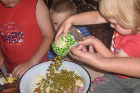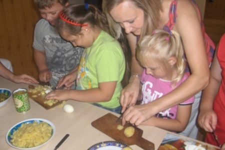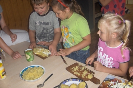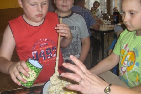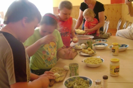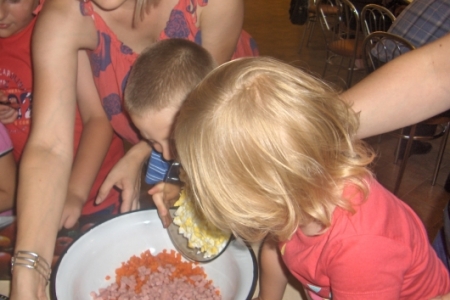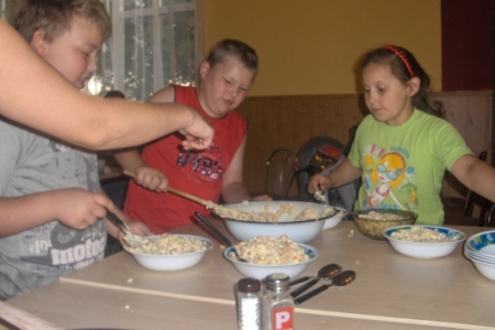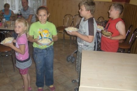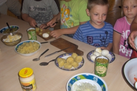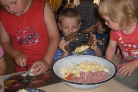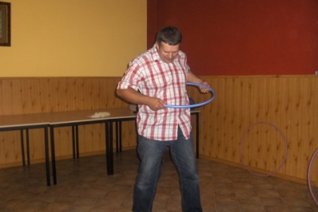 A byłą to sałatka warzywna. Dzieci bardzo się starały, z chęcią kroiły warzywa. Mamy pomagały wymieszać i podać sałatkę do stołu. Wszystkim bardzo smakowała sałatka. Po jedzeniu i siedzeniu nastąpił czas na ruch. Tatusiowie wzięli udział w „ kręceniu hula-hop”. Zabawa cieszyła się powodzeniem i wywołała bardzo dużo śmiechu. Na imprezie wypróbowaliśmy naszą nagrodę w konkursie sołectw na dniach Cieszkowa, elektrycznego grilla. Na spotkaniu przewodnim tematem był pewien HIT, o którym usłyszymy wkrótce ;)