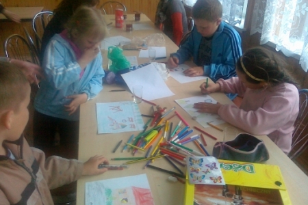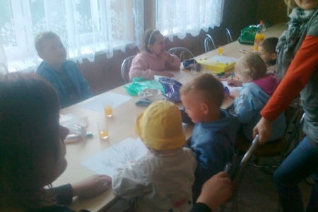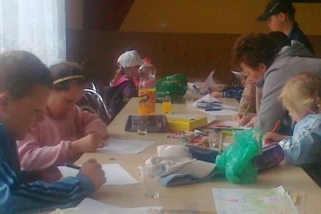Wczoraj wszystkie chętne dzieci z naszej miejscowości zebrały się w świetlicy żeby narysować prace pt. "Pocztówka z naszej gminy". Dzieciom przygrywały przeboje lat 60-tych tj. "Zielone wzgórza nad Soliną", "Pod papugami" czy "Dziwny jest ten świat". Bardzo spodobała się ta muzyka. Widać więc, że stare dobre przeboje nie starzeją się nigdy. Dorośli zadbali o podniebienie milusuńskich. Były napoje i pop corn.