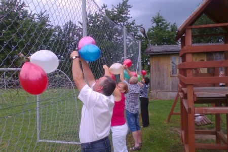 Po dwóch godzinach nad nasze boisko wyszły chmury i spadł deszcz, ale to nie zespsuło nastrojów wśród dzieci. Impreza w ciągu kilku minut przeniosła się do "baraku" gdzie wszyscy bez problemu się pomiescili. Miejsca było na tyle dużo, że dzieci mogły spokojnie biegać i bawić się w środku. Wszystkie dzieci losowały niespodzianki. Wśród nich było dużo skakanek, hula-hopy, chipszy, kredki, pisaki , notesiki, gadżety DOLINY BARYCZY, gadżety EURO KIBICóW, drobne zadawki.