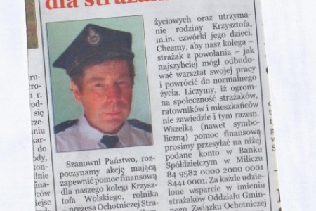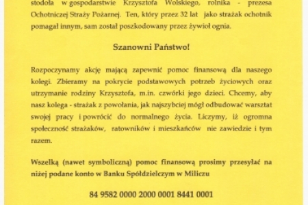 Poraz kolejny apelujemy o pomoc finansową dla naszego kolegi Krzysztofa Wolskiego, rolnika- prezesa Ochotniczej Straży Pożarnej z Nowego Zamku, któremu spłoneła stodoła.