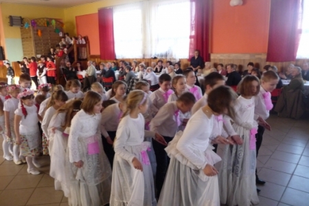 Goście aktywnie uczestniczyli w przedstawieniach muzycznych, włączając się w śpiew takich znanych melodii jak: „SERDUSZKO PUKA”, czy „SERCA DWA”. Te przepiękne utwory wprawiły zgromadzonych w dobry humor, na twarzach gościł uśmiech. Pierwszacy zaprezentowali także tańce ludowe: wielkopolskie: MARYNECZKĘ oraz KŁANIANEGO oraz rzeszowski taniec HURRA POLKA. Młodzież przygotowała nowoczesne układy taneczne. Na zakończenie wspólnie odśpiewano „Sto lat” dla wszystkich zgromadzonych seniorów, a następnie wręczono przygotowane wcześniej przez uczniów „Laurki”. Po części artystycznej gości zaproszono na skromny poczęstunek.