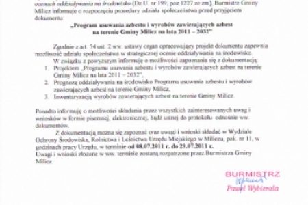 W załączonym obwieszczeniu z 30.06.2011 r. Burmistrz Gminy Milicz informuje o rozpoczęciu procedury udziału społeczeństwa w ramach strategicznej oceny oddziaływania na środowisko przed przyjęciem dokumentu„Program usuwania wyrobów zawierających azbest na terenie Gminy Milicz na lata 2011-2032".