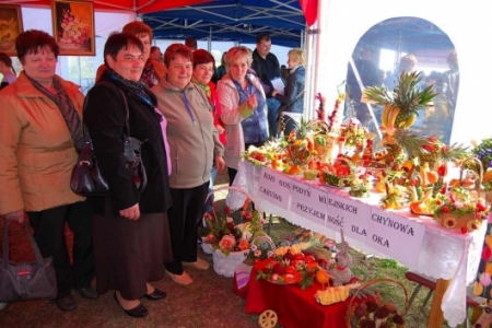 Przedstawicielki Koła Gospodyń Wiejskich w Chynowej w składzie: Przewodnicząca KGW Barbara Kuroszczyk, Maria Skowrońska, Elżbieta Piec, Urszula Pacyna, Łucja Gabryś, Teresa Guździoł, Kazimiera Szukalska oraz Genowefa Wojtkowska podczas gali w godny sposób reprezentowały nasze sołectwo, eksponując na stoisku wystawienniczym efekty realizacji projektu „Carving – przyjemność dla oka”. Panie z Koła Gospodyń Wiejskich swoją obecnością wspierała inicjatorka i koordynatorka projektu „Carving – przyjemność dla oka” - Karolina Walczybok. Stoisko naszych pań z KGW wzbudzało ogromne zainteresowanie. Członkinie KGW chętnie odpowiadały na zadawane im pytania, związane z nowoczesną metodą dekoracji warzyw i owoców zwaną carvingiem. Podczas Gali Pani Maria Skowrońska dokonała krótkiej prezentacji, dotyczącej realizacji wyróżnionego w konkursie projektu „Carving – przyjemność dla oka”. Wskazała na korzyści i szanse płynące z jego realizacji.