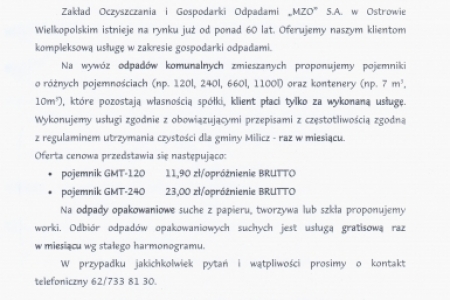 Alba czy Ostrów Wlkp. Alba pojemnik 120 l 13,90 worki gratis Ostrów wlkp. 120 l 11,90 worki gratis Ostrów Wlkp. Lista u sołtysa do zapisywania się celem podpisania umowy z Firmą Zakład Oczyszczania i Gospodarki Odpadami „MZO”SA siedziba firmy ul Wiejska 18 w Ostrowie Wlkp.