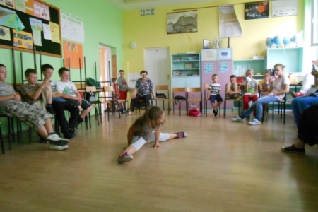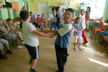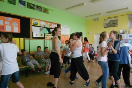 Dzieci i młodzież uczestniczyły w karaoke i przy tym świetnie się bawiły, tańcząc w parach czy też w kole. Ci najmłodsi i zarazem bardzo odważni zaprezentowali tańce ludowe. Starsze dziewczynki przewodniczyły reszcie grupy, przedstawiając kroki ZUMBY (popularnej formy tańca), która w naszej miejscowości posiada liczne grono swoich miłośników.