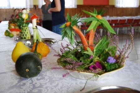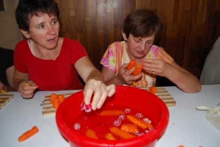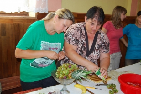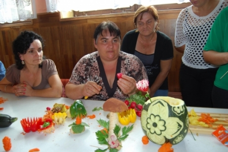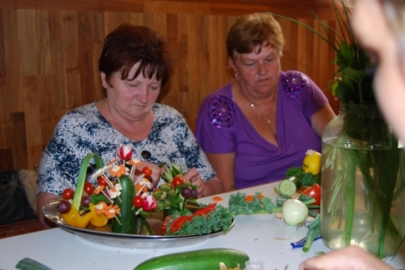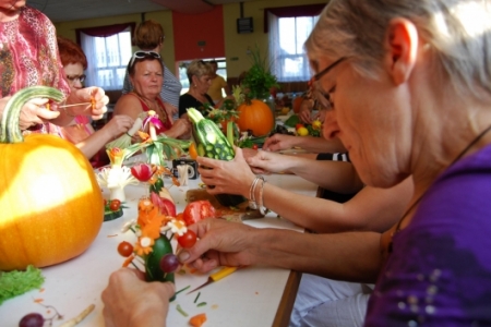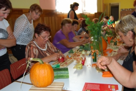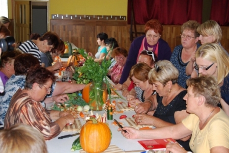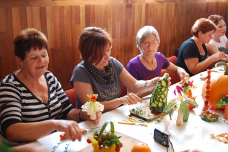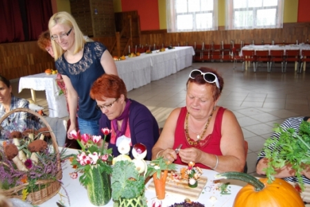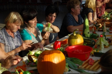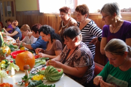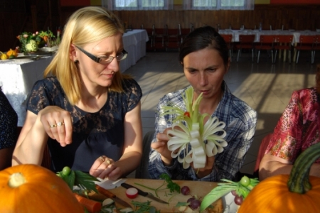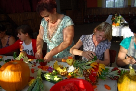 Warsztaty carvingu przeprowadziły członkinie Koła Gospodyń Wiejskich w Chynowej. Udział w nich wzięli przedstawiciele następujących sołectw: BUKOWINKA, CHOJNIK, GRANOWIEC, PAKOSŁAWSKO, JANKOWA, BUKOWICE, LĘDZINA, POTASZNIA i GóRY. Łącznie w warsztatach uczestniczyło 35 osób. Wśród kobiet, które postanowiły spróbować swoich sił w dziedzinie dekoracji warzyw i owoców tzw. „carvingu”, znalazł się również jeden pan. Widać było ogromne zainteresowanie tą techniką i jednocześnie fascynację. Materiały wykorzystane podczas zajęć zostały zapewnione przez Stowarzyszenie „Partnerstwo dla Doliny Baryczy”.