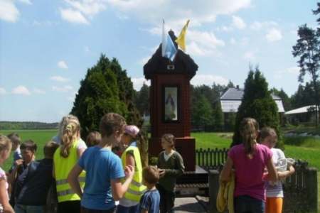 Jeszcze dziś przejeżdżając w majowy wieczór przez polskie wsie można usłyszeć pieśni maryjne. Zwyczaj ten trwa dopiero od połowy XIX wieku. Kilku uczniów wpadło na pomysł, aby ten zwyczaj wprowadzić również w naszej miejscowości. Z uwagi na to, że w Bogdaju nie ma kapliczki Matki Bożej, udaliśmy się rowerami przez las do pobliskich Smug, które należy do również do naszego sołectwa. W wycieczce wzięli udział uczniowie kl. IV-VI, łącznie 24 dzieci oraz kilka mam. Przy wjeździe do tej maleńkiej miejscowości stoi kapliczka poświęcona Maryi. Została zbudowana w 1931 roku. W czasie II wojny światowej uległa zniszczeniu. Po wojnie została odbudowana i odnowiona. Dziewczynki mieszkające w Smugach (Zosia, Magda, Kamila oraz Karolina z Bogdaju) kilka dni przed wycieczką uporządkowały miejsce wokół kapliczki, wyplewiły chwasty i zerwały kwiaty, które postawiły w wazonie dla Matki Bożej. Chłopcy natomiast (Mateusz i Krystian) zaprosili mieszkańców Smug na nasze nabożeństwo majowe. Kiedy byliśmy już na miejscu zaśpiewaliśmy wszyscy razem kilka pieśni maryjnych m.in. „Czarną Madonnę”. Następnie pani katechetka opowiedziała nam krótko o historii i roli nabożeństw majowych oraz o litanii loretańskiej, którą wraz z przybyłymi mieszkańcami i rodzicami wspólnie odśpiewaliśmy. Modlitwa na łonie natury była zawsze bliska św. Franciszkowi z Asyżu i nam również wydaje się być ona bardziej przystępna i przyjemna. Jeśli chodzi o przyjemności, to takich, jakie za chwilę miały miejsce, nikt z nas się nie spodziewał. Po kolejnych pieśniach ku czci Matki Bożej gospodynie ze Smug – p. Anna Mus i p. Krystyna Żychlińska przybyły z trzema blachami ciasta. Ponadto mama naszych kolegów ze szkoły: Mateusza i Zosi zasponsorowała dla wszystkich oranżadki i 2 rodzaje lodów. Wszyscy stwierdzili, że to była naprawdę udana wycieczka i interesująca lekcja religii. Już dziś planujemy kolejne nabożeństwo majowe. Do której kapliczki udamy się tym razem, okaże się już wkrótce.
