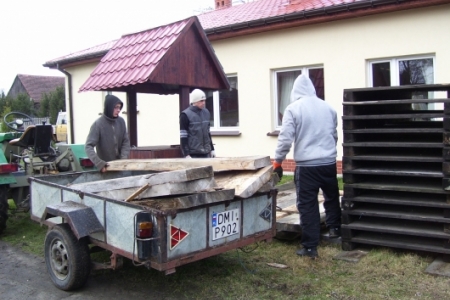 W sobotę mimo niesprzyjającej pogody zostały rozpoczęte prace na boisku.Jesienią boisko zostało zaorane i z nastaniem wiosny wznawiamy prace.Nasi panowie ostro wzięli się do pracy.Poszły w ruch piły które wycinały krzaki i zbędne gałęzie.Postawili tablicę inforamcyjną koło świetlicy, przewieźli podłogę i wyzbierali kamienie.