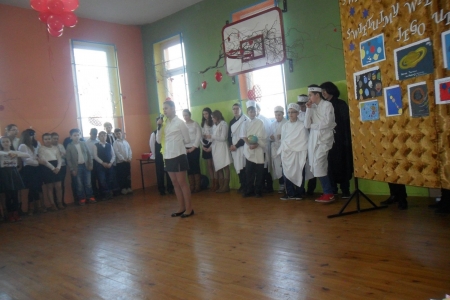 Pani Barbara Dwojak, nauczycielka podstawówki wraz z uczniami starszych klas ciekawy program artystyczny opowiadający o wszechświecie.