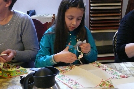 Teraz ozdobić trzeba prawdziwą wydmuszkę jajka gęsiego! Ponieważ pierwsze zadanie Panie – i przepraszam jeden młody człowiek! – wykonały fantastycznie z wielkim przejęciem przystąpiły do dekorowania ! Rezultaty były oszałamiające. Powstały małe dzieła sztuki , które ozdobią lędzińskie domy w świąteczny czas.