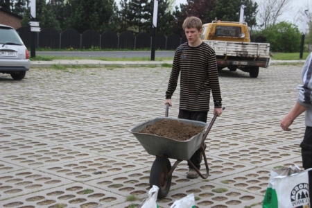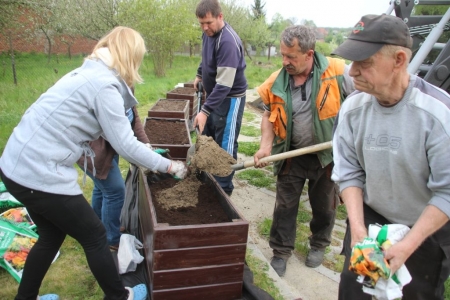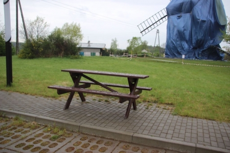 Wzdłuż wjazdu na parking, ustawiono 8 drewnianych donic, a 2 - obok Chaty Młynarza. Wykonano też, i ustawiono obok parkingu, od strony wiatraka - 2 drewniane ławostoły. Wykonanie skrzyń i ławostołów, było procesem wieloetapowym i pracochłonnym. Drewniane donice musiały byc solidne i wykonane zgodnie ze sztuka stolarską. Później należało je kilkakrotnie pomalować, aby zabezpieczone farbą drzewo, zachowalo dłuższą żywotność. Na szczęście, nie zabrakło wśrod meszkańców Duchowa osób, które nie szczędziły swego czasu i energii na wykonanie tych wszystkich prac. Za poszczególne prace, wykonywane na różnych etapach realizacji,należą się gorące podziekowania : Jurkowi i Grażynie Nowackim, Stasi i Stasiowi Zwierzchowskim, Agacie i Reni Wanatom, Marzenie Bieńkowskiej, Bogdanowi Drozd oraz synom:Damianowi i Pawłowi, Ewelinie i Markowi Dulom ,Kazi i Bogdanowi Ludwiczakom,Ani Kupce, Ryskowi Kuligowi i Władkowi Zdobylakowi. Dodatkowe podziękowania należą się Jurkowi Nowackiemu, za użyczony sprzęt oraz mozliwość wykonania i składania drewnianych elemenów skrzyń i ławostołów, na terenie swojej posesji.