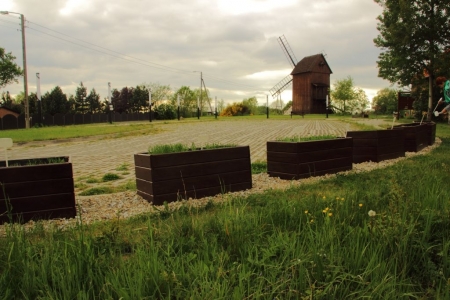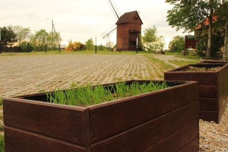 Zasiane kilkanascie dni temu w drewnianych donicach, na placu przy wiatraku - ziarno,wzrasta. Widoczne gołym okiem rosliny,coraz wyraźniej zaczynają się piąć w górę.