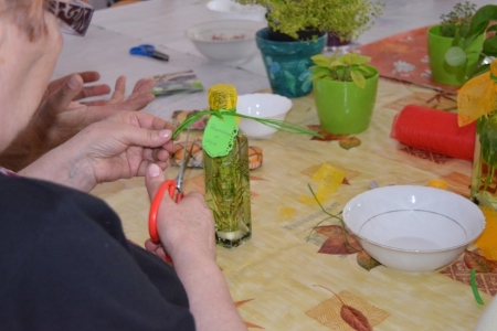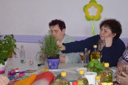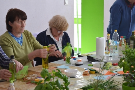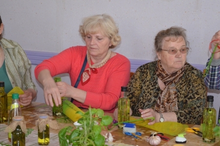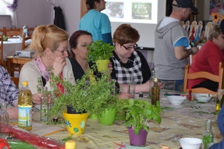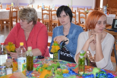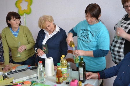 Ostatnim punktem objazdu były Łazy, więc już jako gospodarze przywitaliśmy przybyłych. Na obiad zaserwowaliśmy oczywiście zupę cioci Halinki oraz łazanki i paluchy ziołowe. Był oczywiście quest "Zdrowe i pachnące Łazy" oraz prezentacja działalności wsi na slajdach oraz w postaci naszego rękodzieła. Podczas warsztatów pokazaliśmy jak wykonać samodzielnie zioła w oliwie lub occie. Niestety wszystko co dobre musi się kiedyś skończyć, więc nasi goście odjechali do swoich domów.