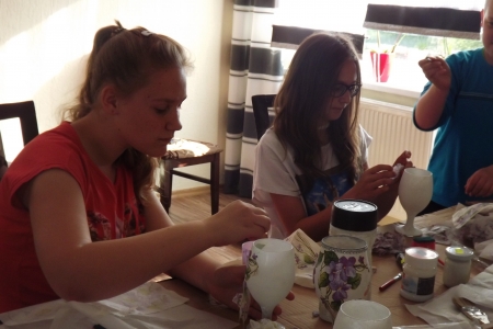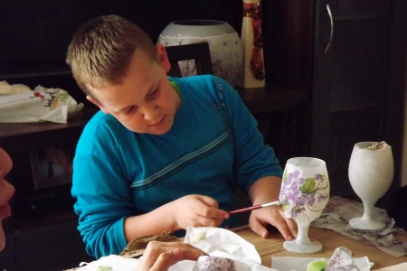 Dzieci i młodziez z zespołu „Pierścienie” podczas przygotowania do Dnia Mamy, przygotowały dla nich samodzielnie wykonane przez siebie wazony, lampiony czy flakoniki. Efekt był bardzo ładny.