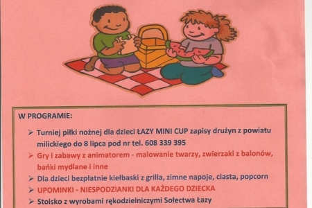 12 lipca w niedzielę od 14.00 zapraszam wszystkie dzieci na boisko sportowe w Łazach na Dziecięcy Piknik - czekają zabawy z animatorem, malowanie twarzy, zwierzaki z balonów, bańki mydlane, turniej piłki nożnej, kiełbaski, lody i słodkie upominki.