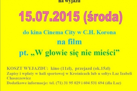 15 lipca organizowany jest wyjazd do kina na bajkę "W głowie się nie mieści". Koszt wyjazdu 26 zł. Godzina wyjazdu zostanie podana w późniejszym terminie.