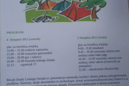 Biwak Osady Leśnego Dziada to: prezentacja rzemiosła, kuchni i obozu; pokazy przygotowania posiłków. Namioty, stroje słowiańskie to archeologia żywej wczesnośredniowiecznej historii a w niej gry i zabawy oraz biesiada leśnego dziada. Przestrzeń edukacyjna w której uczestnicy poprzez zabawę i warsztaty artystyczne poznają treść związane z średniowiecznego życia w osadzie.