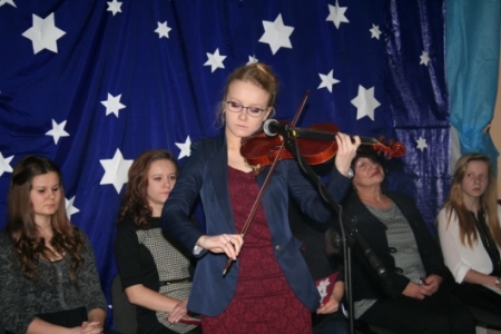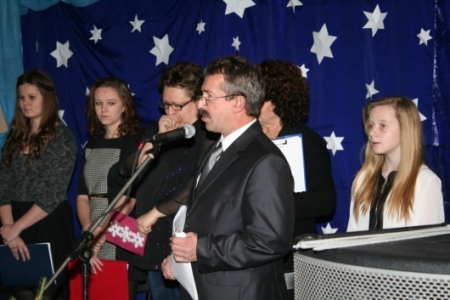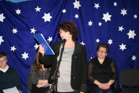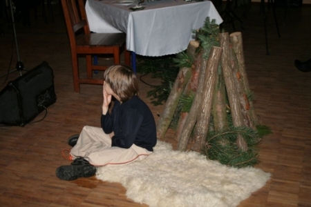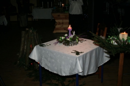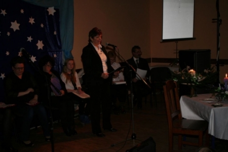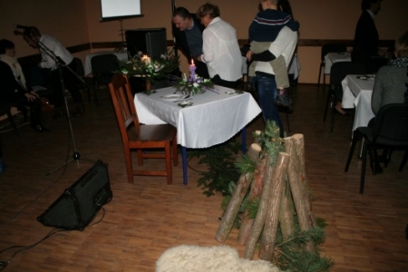 O godz. 17 - tej zapełniły się miejsca za stołami. Zrobiło się cicho.Nastała atmosfera oczekiwania i po chwili… rozpoczęło się Pierwsze Misterium Wigilijne – Duchowo 2013. Po wielotygodniowych próbach, przyszedł czas, aby zaprezentować zebranym ,słowno - muzyczną narrację o Świętach Bożego Narodzenia - starannie przygotowany program poetyczno - muzyczny. Wśród wykonawców - przekrój pokoleniowy; zespół utworzony przez młodszych i starszych mieszkańców Duchowa i Rudy Milickiej. Na sali panował półmrok - rozświetlany jedynie blaskiem zapalonych świec na stołach. Na zaimprowizowanej scenie - świąteczna dekoracja; choinka, sztuczne ognisko - rozświetlane migotaniem sztucznego światła i ze ...sztucznym dymem. Przed sceną - stół z krzesłem i nakryciem, dedykowany dla ...nieobecnych. Była gra kolorowych świateł scenicznych, które tworzyły odpowiedni nastrój na scenie. Światła raz zapalały się, raz przygasały i gasły… jakby akcentowały i wzmacniały początek i koniec danej narracji. Na sali, panowała niczym nie zmącona pełna skupienia cisza i wyczuwało się nastrój ... oczekiwania na, każdy kolejny wiersz, kolejną pastorałkę, kolejną kolędę. Calość widowiska rozpoczęła kolęda „Cicha noc”, którą misternie na skrzypcach wykonała Joasia . Nie zawiedli pozostali artyści, czyli mieszkańcy Duchowa i Rudy Milickiej, którzy pięknie, z poprawną dykcją, wyczuciem i spokojem - wypowiedzieli i wyrecytowali swoje kwestie. Wszystko się udało i całe widowisko robiło wrażenie sprawnej machiny, która wprawiona w ruch - po kolei i płynnie przechodzi przez zaprogramowane cykle swojej pracy. Nastrojowe i urokliwe pastorałki i kolędy – dopełniały całości i budowały Bożo Narodzeniowy nastrój. Białe obrusy na stołach, świateczne stroiki,rozłożone na talerzach opłatki, zapach choinki - wszystko to razem stwarzało wrażenie - jednej wielkiej rodzinnej wieczerzy wigilijnej...