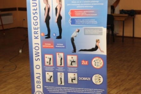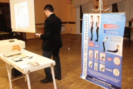 Bóle pleców to plaga współczesnych społeczeństw.Dotykają wszystkich bez względu na wiek.Mogą być wynikiem poważnych schorzeń,z reguły są rezultatem zaniedbań.Tymczasem zachowanie zdrowia i dobrej kondycji naszych pleców nie jest trudne – wymaga jedynie cierpliwości, determinacji i zapamiętania kilku podstawowych zasad. Dlatego powstał pomysł na lokalny projekt zdrowotny, którego celem jest połączenie wiedzy o kręgosłupie z cotygodniowymi godzinnymi ćwiczeniami fizycznymi, prowadzonymi pod wprawnym okiem instruktorki - Joanny Ludwiczak, która dobrała odpowiednie rodzaje i zestawy ćwiczeń.Pierwsze spotkanie było wprowadzające i miało na celu omówienie funkcji kręgosłupa oraz dolegliwości jakie najczęściej powstają z takich powodów,jak: brak ćwiczeń, długotrwała praca siedząca, niewygodne miejsce pracy,stres itd.Tematykę tych spraw omówił Pan Marek Tomczyk - dyplomonwany specjalista ds rehabilitacji.Dwugodzinna tematyczna prelekcja połączona z pokazem multimedialnym oraz prezentracją sprzetu do ćwiczeń - przykuwała uwagę zainteresowanych poprawą zdrowia.