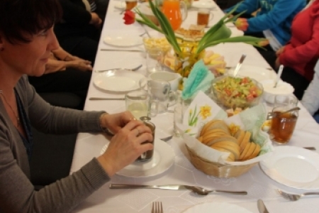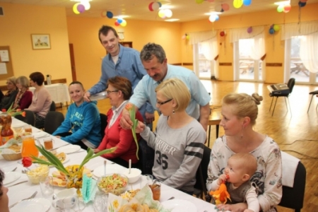 Wszystkie Panie oprócz gorących życzeń,które złożył Jerzy Nowacki - sołtys Duchowa, otrzymały tradycyjnie czerwonego tulipana.Później był poczestunek. Podawano kawę,herbatę,ciasto,napoje,były sałatki, były również dania gorące.W tym dniu odwróciły się zwyczajowe role,nie mogło być inaczej: Panie ,mające status gości spotkania, wygodnie zasiadły za zastawionym stołem,a Panowie w całości przęjeli rolę gospodarzy, którzy od początku do końca trwania spotkania usługiwali Paniom, bardzo sprawnie wywiązując się z tej roli.
