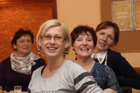 Kiedy atmosfera spotkania nieco się rozluźniała - przyszedł czas na wspólną zabawę. Bardzo trafionym pomysłem okazała się zabawa w karaoke.Wyświetlane na ekranie teksty popularnych i biesiadnych piosenek wraz z akompaniamentem - rozbawiły wszystkich na 100%. Bo chyba nic tak nie integruje ludzi,jak właśnie wspólny stół i wspólne śpiewanie.Dobry nastrój i humor utrzymywał się przez cały czas trwania spotkania.Radość ze wspólnego spiewania była ogromna.W pewnym momencie,aż chciało się zgodzić z poetą i jego słowami; "gdzie słyszysz śpiew, tam wejdź, tam dobre serca mają...".