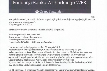 28 sierpnia otrzymaliśmy maila z informacją, że Stowarzyszenie "Aktywne Łazy" otrzymało grant w wysokości 4000 zł z Fundacji WBK w drugiej edycji konkursu "Tu mieszkam, tu zmieniam" na realizację projektu "Łazy - wioska ziołowa".