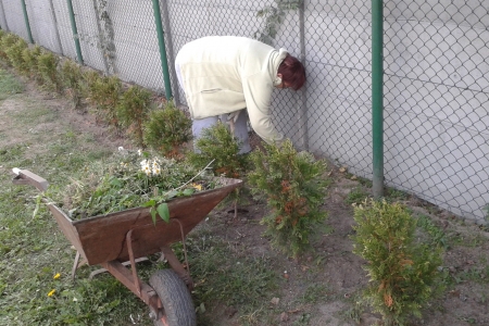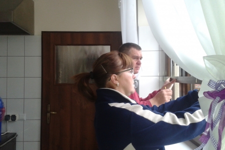 Na moją prośbę przybyły dwie kobietki Janka i Bronia, które solidnie wypieliły chwasty wokół zielonych drzewek. Przyszedł też Artur ze swoją żoną Gabrysią ,aby zamocować rolety w oknach, powiesić dyplomy na ścianach po remoncie. Prace wykonane a kawka poranna wypita.