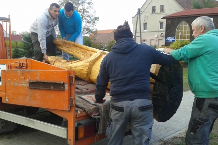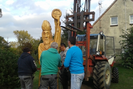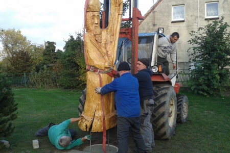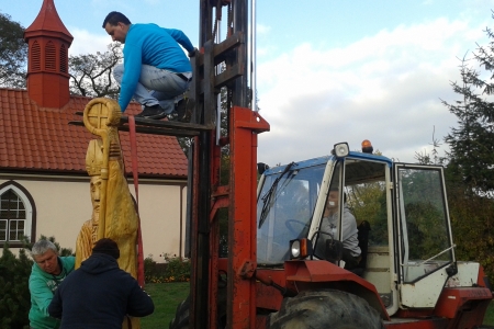 W dniu wczorajszym grupa aktywnych mieszkańców przewiozła rzeźbę z pracowni pana Mariana, na plac przy kościele. Tam przy pomocy mocnego sprzętu zamontowano rzeźbę. Było ciężko, ale udało się. Dziękuję panom za ich bezinteresowną pomoc. W taki oto sposób św Wojciech przywędrował ponownie do Słączna.