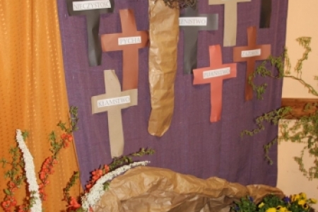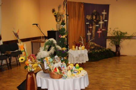 W tym dniu w świetlicy zapanował świąteczny wystrój i nastrój. Typowa dla tego święta dekoracja; wielkie kolorowe pisanki, kolorowe zajączki, kolorowe palmy, płonące świece, wizerunek Pana Jezusa w koronie cierniowej. Nastrojowe oświetlenie. Przekaz artystów - amatorów płynący z zaimprowizowanej sceny, opowiadał , wyjaśniał i komentował istotę tych wielkich świąt. W treści Misterium pojawiły się wiersze Herberta, księdza Twardowskiego, Baczyńskiego. Było o ogrodzie oliwnym, o biczowaniu, o cierpieniu i śmierci. Były uderzenia młotem, który przybijał, było bicie serca, były odgłosy żywiołów… Ważne treści były też zaśpiewane. Było o Golgocie, o przymierzu i o tym by się nie lękać. Wszystko to po to by licznie zgromadzonym w tym dniu w świetlicy, przypomnieć historię sprzed ponad dwóch tysięcy lat. Na koniec był radosny akcent, bo o zmartwychwstaniu ! Wtedy wszyscy wstali i razem śpiewali o tym, by się …nie lękać !