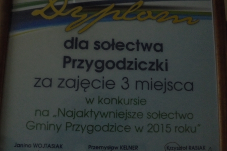 Na uroczystej gali w GOK-u w Pzygodzicach zostały rozdane nagrody dla najaktywnijszego sołectwa w gminie Przygodzice. Nasza wioska zdobyła zaszczytne III miejsce, czego gratulujemy Pani Sołtys oraz osobom zaangażowanym. Życzymy powodzenia w przyszłym roku.