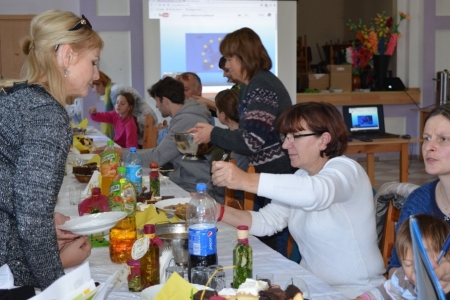 Spotkanie rozpoczęło się od serwisu kawowego, podczas którego grupa obejrzała prezentację „Łazy– wioska ziołowa”, a także miała okazję spróbować ciast upieczonych przez mieszkanki.
