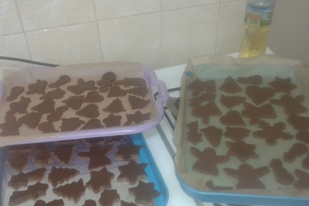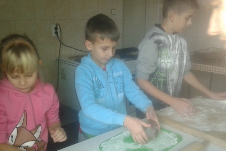 Najpierw każde z przybyłych dzieci ubijało jajka z cukrem, następnie wyrabiało ciasto na jednolitą masę, rozwałkowało ciasto i wycinało foremkami: gwiazdki, choinki, bałwanki, mikołaje, serca.