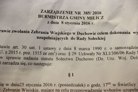 W dniu 25 stycznia o godz.18.30 odbyło się zebranie wiejskie. Głównym celem zebrania były wybory uzupełniające do składu Rady Sołeckiej. W zebraniu udział wzięło 30 mieszkńców Duchowa. Kazimiera Defratyka-Ludwiczak sołtys wsi złożyła serdeczne podziękowania Grażynie Nowackiej oraz Zenonowi Czerniawskiemu za dotychczasową pracę i zaangażowanie w Radzie Sołeckiej na rzecz sołectwa. Oboje otrzymali z rąk sołtysa po kolorowej róży.