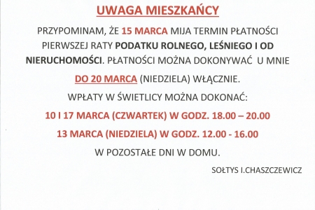 1Zwołujemy zebranie wiejskie na dzień 28 lutego 2016 roku (niedziela) na godz. 16.00 w świetlicy wiejskiej w Łazach Małych. Obecny będzie wójt Andrzej Biały.