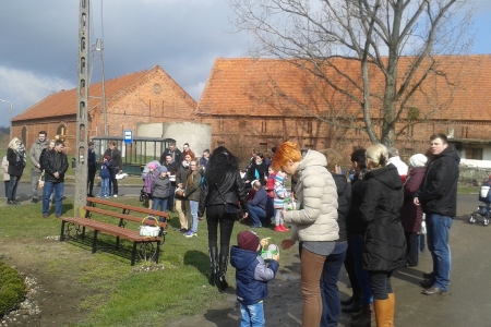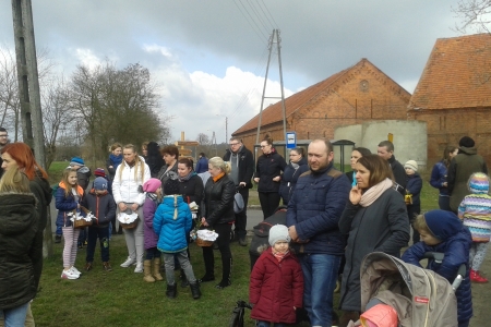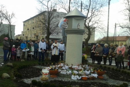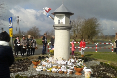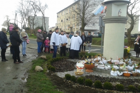 W wielką sobotę mieszkańcy Słączna zgromadzili się przy przydrożnej figurce, by poświęcić swoje pokarmy przeznaczone na wielkanocne śniadanie. Pogoda dopisała choć cięzkie chmury nad nami wisiały.