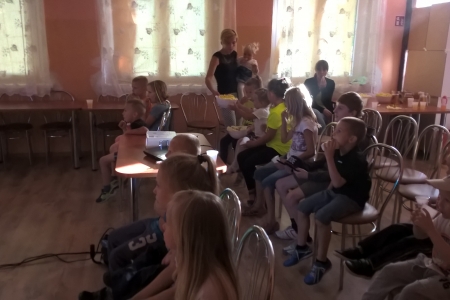 Po zmaganiach konkursowych oraz sprawnościowych na dzieci czekał pokaz filmowy w świetlicy wiejskiej - bajka "W głowie się nie mieści" oraz poczęstunek.