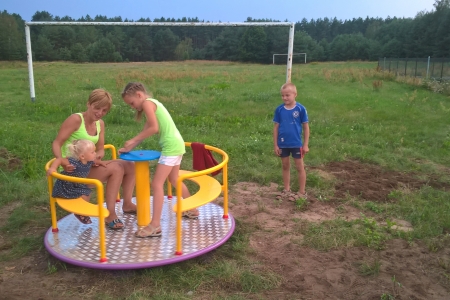 Niestety przed otwarciem musieliśmy jeszcze dostosować się do wymogów Inspektora z UM w Miliczu i wykonać kilka prac. Mianowicie wykorytować strefę bezpieczeństwa pod huśtawką wahadłową oraz wysypać ją piaskiem (około 28 m2).