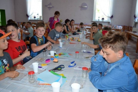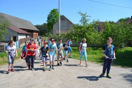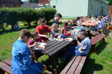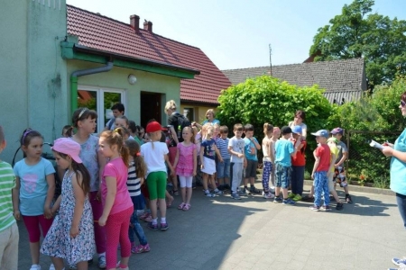 24.05.2016 przyjechały do nas klasy pierwsze z Zespołu Szkół w Bukowicach. Przyznać musimy, że ta grupa najdokładniej szukała skarbu, słuchała swoich opiekunów, zwiedzała okolicę... Po odnalezieniu skarbu, wszyscy przybili sobie pamiątkową pieczątkę i przystąpiliśmy do zajęć. Dziś uczniowie wykonali aniołki z masy solnej, a na zakończenie zasiedliśmy w naszym przyświetlicowym zakątku aby zjeść upieczoną na ruszcie kiełbaskę. Dziś było bardzo gorąco, więc na stole czekała nasza "ziołanka" czyli woda z cytryną i miętą...