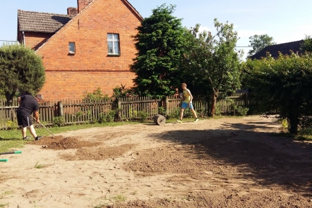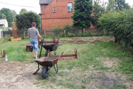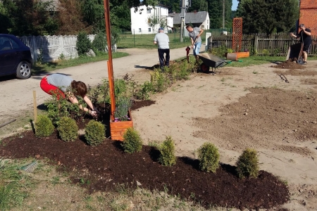 Projekt powoli się kończy, ale jeszcze trochę pracy mamy do wykonania. W sobotę grupa mieszkańców spotkała się przy świetlicy, aby wyrównać obsadzony teren, ponieważ w końcu udało nam się pozyskać nieodpłatnie ziemię. Przy okazji obsypaliśmy rośliny korą, oraz pomalowaliśmy stół i ławki. Jeszcze tylko wysiejemy trawę, ustawimy pergolę i obudowę koszy na śmieci i koniec