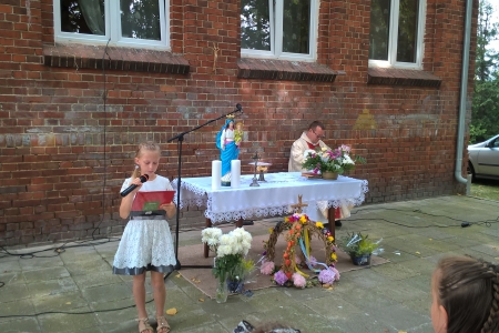 Rozpoczęły się o godzinie 14:30 od Mszy Św. Dożynkowej odprawionej przez ks. Marcina Nesterowicza. Mieszkańcy postarali się o to żeby nasze wspólne spotkanie przy modlitwie było jeszcze bardziej uroczyste - dzieci przygotowały czytania, psalm, mieszkańcy przynieśli dary do ołtarza. Po Mszy Św. ks. Marcin poświęcił nasz nowy plac zabaw oraz wiatę.