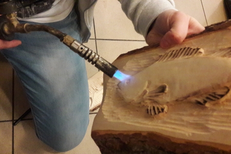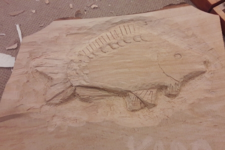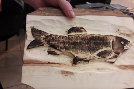 Za kilka dni zakończymy projekt p.t. "Nie pójdziesz w ogień klocku mój" Ale póki co pracujemy nad swoimi tabliczkami, wychodzi to nieżle a to za sprawą naszej instruktorki Patrycji, która dzielnie spisuje się na każdych warsztatach. Uczestnicy poznali nową metodę pracy z drewnem tzw -wybieranie. Tabliczki te przyozdobią nasze domy. Pod każdym numerem posesji będzie tabliczka z wizerunkiem ryby. Każda inna ,niepowtarzalna i dla każdego najpiękniejsza.