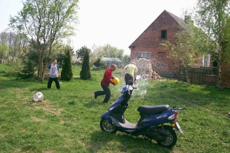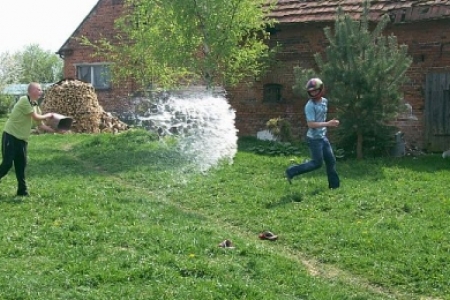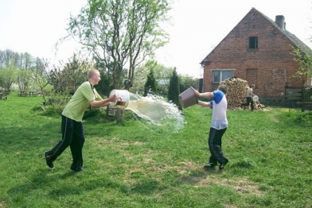 W WIELKANOCNY PONIEDZIAŁEK, choć pogoda nie dopisała młodzież z Dziadkowa oblewała się wodą. Było przy tym dużo zabawy i śmiechu. Oblewanie co dla niektórych skończyło się kąpielą w stawie.