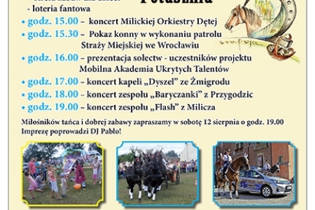 !3 sierpnia 2017 roku zapraszamy do Potaszni gdzie w ramach Święta Wsi odbędzie się sołecki jarmark. Podczas jego trwania sołectwa uczestniczące w projekcie "Mobilna Akademia Ukrytych Talentów" będą prezentowały swój dorobek i dotychczasowo zdobyte umiejętności.