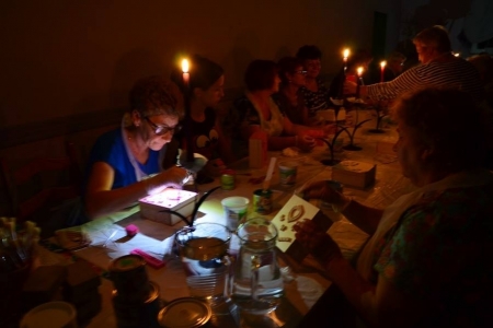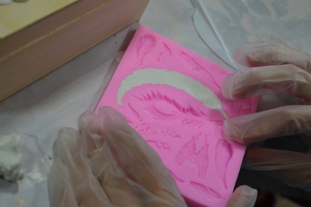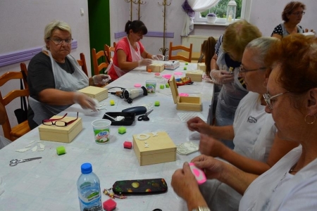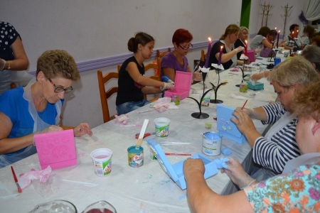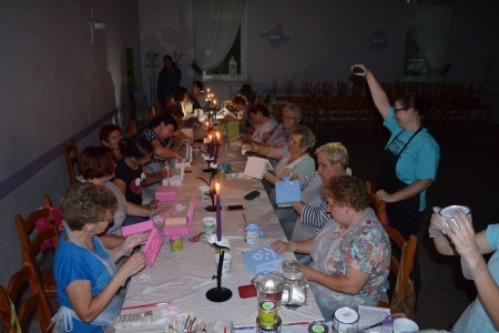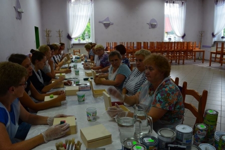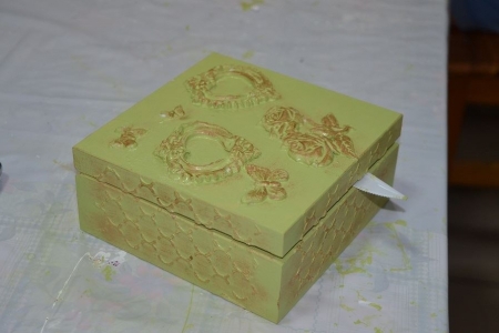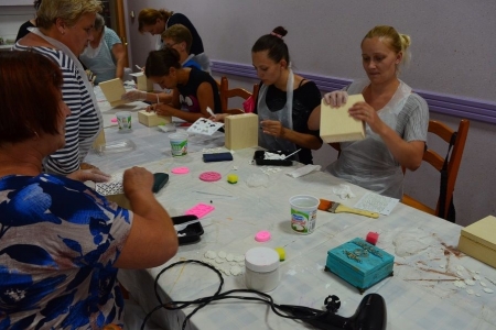 Na warsztatach licznie zgromadzone panie wykonały szkatułki - herbaciarki poznając nowe techniki rękodzielnicze: wyciski z foremek silikonowych z masy typu Das, wzory z szablonów wykonane pastą strukturalną, zastosowanie past pozłotniczych oraz tzw. malowanie suchym pędzlem, aby nadać koloru szczegółom. Choć za oknem szalała wichura i przez jakiś czas pracowałyśmy przy świecach bo nie było prądu, udało się paniom wykonać szkatułki i choć każda wykonana tymi samymi technikami, każda była inna w zależności od upodobań właścicielki, zastosowanych wycisków i kolorów.