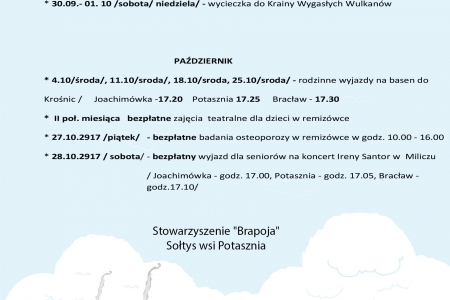 Stowarzyszenie "Brapoja" wraz z sołtysem i radą sołecką zapraszają mieszkańcow sołectwa do uczestnictwa w planowanych zajęciach na 2 najbliższe miesiące. Będzie się działo!