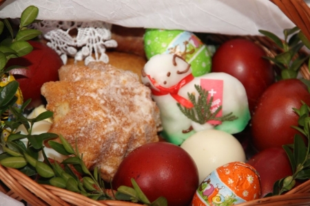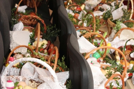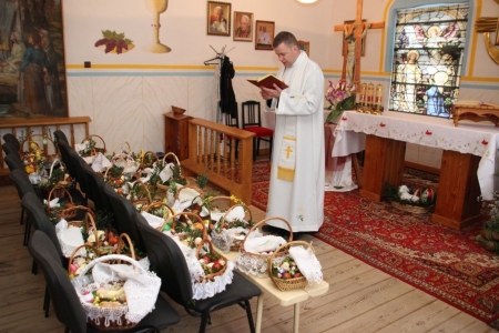 Stary obrzęd święcenia pokarmów - znany w kościele katolickim już w VIII wieku, pielęgnowany jest w większości polskich domów. Na tradycyjnym wielkanocnym stole stawiano święcone kiełbasy, chrzan, szynki, lukrowane baby, mazurki. Główne miejsce zajmował baranek z masła lub cukru jako pamiątka pierwszej nocy paschalnej oraz pisanki.