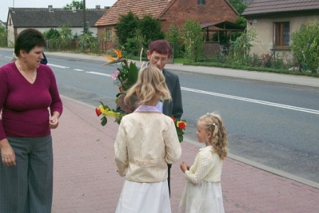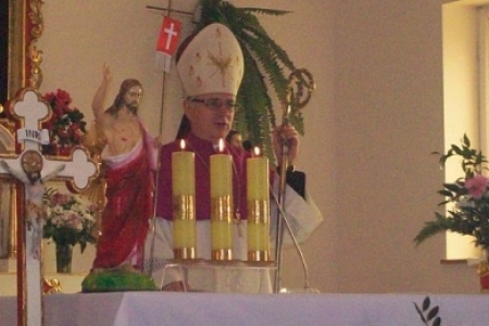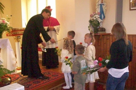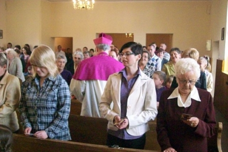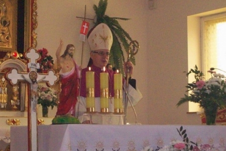 Sobota dzień zachmurzony, miejscami prześwituje słońce. Ludzie gromadzą się w kaplicy idą rodzinami, piękny widok dziadków idących pod pachę. Dzieci szykujących się by powitać naszego gościa biskupa ANDRZEJA SIEMIANOWSKIEGO. Jest, przyjechał ktoś krzyknął! – ludzie z radością witają pasterza. Następnie ksiądz proboszcz skierował słowa powitalne do ks. Biskupa objaśnił skąd i jak powstał nasz dom modlitwy. Zaczęło się nabożeństwo majowe w społeczeństwo w skupieniu modli się. Przewodnim słowem biskupa były słowa św. Pawła (Ga5,22)” OWOCEM DUCHA JEST: MIŁOŚĆ, POKóJ, CIERPLIWOŚĆ, UPRZEJMOŚĆ, DOBROĆ. WIERNOŚĆ, ŁAGODNOŚĆ, OPANOWANIE.”